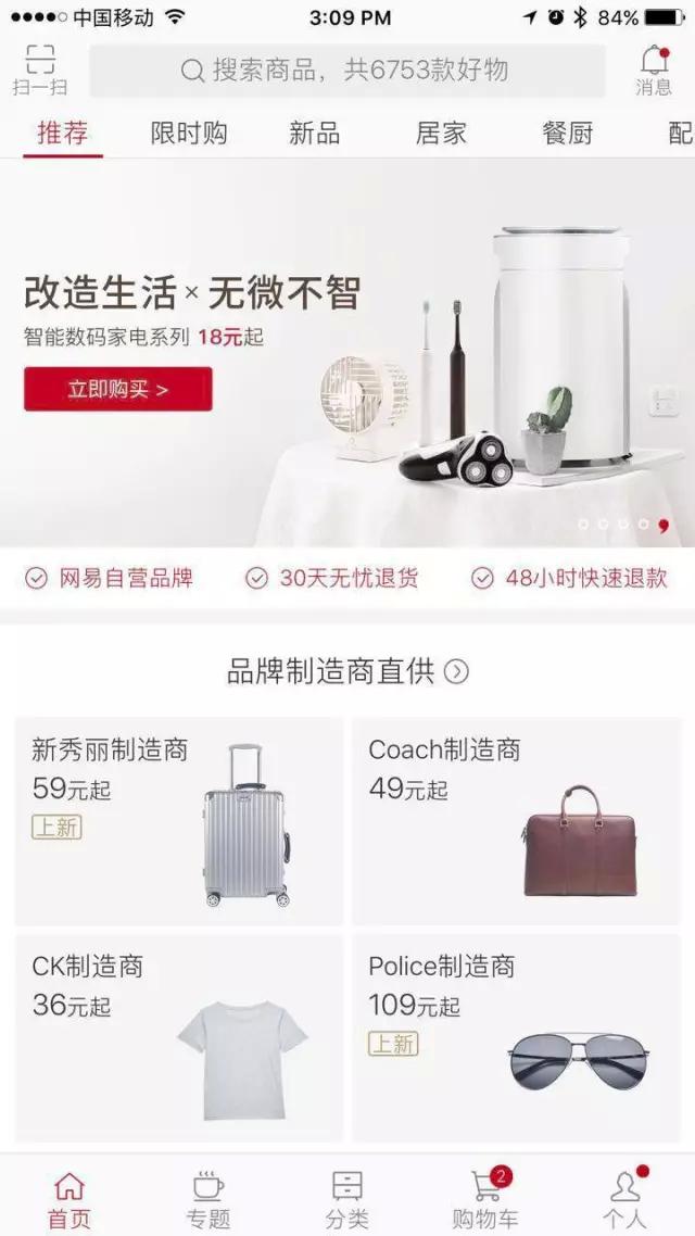 相对于米家,网易严选于2016年4月才面世,它采用ODM(原始设计制造商)模式的电商,一开始便以“好的生活,没那么贵”为品牌理念,它的产品类别,设计风格,APP和网站的界面风格都不得不让人想起无印良品。
