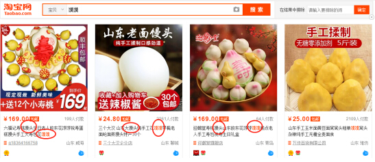 我们可以看到,这些排在前面的标题里,不仅有馍馍还有馒头,因为馒头也是馍馍的另一种叫法,如果我们的标题里只有“馍馍”没有“馒头”,毫无疑问肯定会失去一部分南方的顾客。