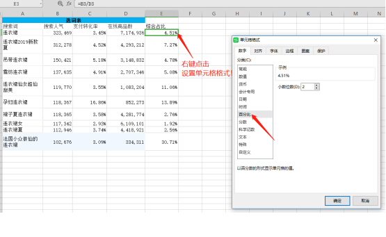 我们点击右键选择单元格格式,把它转化为百分比,百分比越大,这个词就是越好,说明它人气好竞争小!一定要添加到标题或者直通车去推广哦~