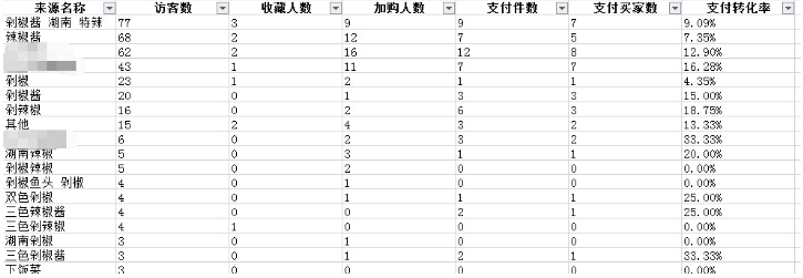 3.打开下载好的表格,留下访客数,收藏人数,加购人数,支付件数,支付买家数,支付转化率。
