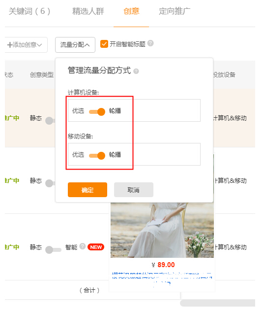创意要求:这个宝贝的创意要求,会更加需求高一些,第一个就是我们的这个宝贝测试的四张创意图,很大因素解决了我们的产品点击率,所以这四张图片,最好是从批量测试中挑选出来图片点击率最好的图,然后在结合我们的同行优质车图,可以直接在淘宝找你的产品核心词,付费展示位靠前,销量较大的的产品,参考他们的创意图的 底色、摆放/模特角度、场景、营销利益卖点 这些创意都是可以借鉴参考的。注意我们四张创意图的最好要各自具备独立不一样的卖点创意,图片不要使用“窦豆图、恶心图”,做好图片之后,选择流量分配为轮播次才能够知道那张图片更加突出。