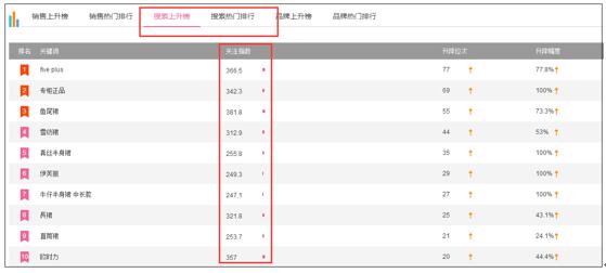 关于如何去判断哪个修饰词会比较好,这里给大家提供一个小思路(其实有生意参谋,应该用生意参谋的标准版,但是如果你是新开店或者小微创业者,可能就没有),你可以用淘宝排行榜(top.taobao.com),然后看一下你准备做的类目的“搜索上升榜”和“搜索热门排行”: